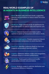 • Instead of just showing that customer churn is rising, an AI agent could trigger a workflow that identifies at-risk accounts and drafts retention emails.